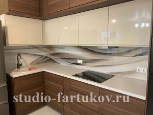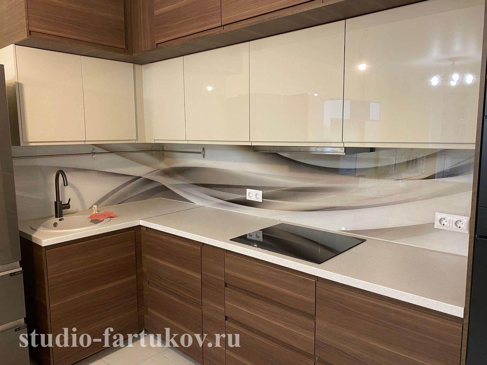 Фартук из осветленного стекла подобран к цвету стола заказчика